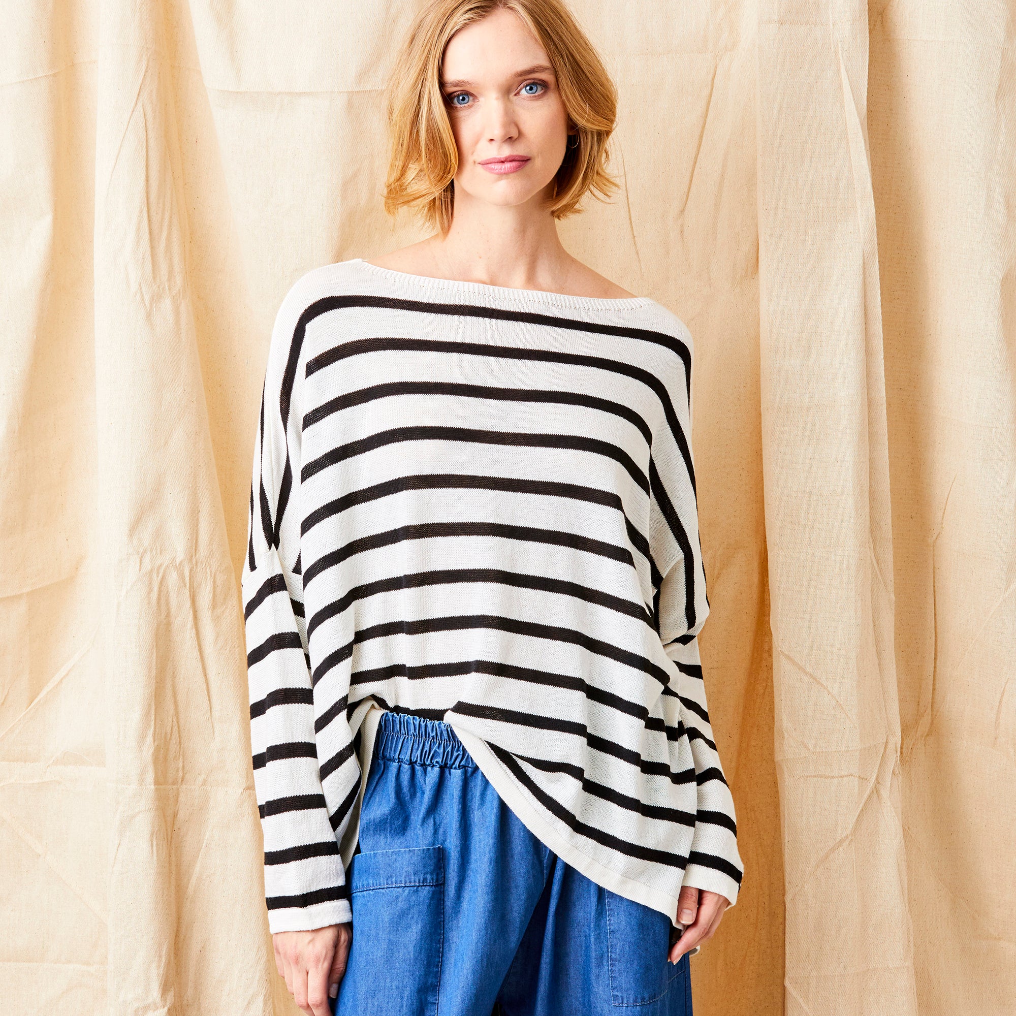 The Fayola Stripe Slash Neck Oversize Knit combines style and versatility with ease. With its horizontal stripes, this piece adds a vibrant touch to any outfit. The asymmetrical hem, longer at the sides, drapes beautifully over the tummy and hips, offering a relaxed and comfortable silhouette. Featuring a slash neck and long sleeves, it brings a touch of sophistication, while the airy knit fabric ensures it's ideal for all seasons.
