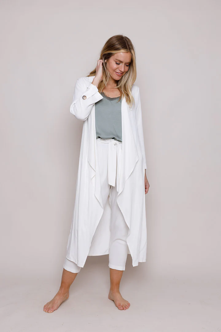 How’s your spring/summer diary shaping up? Formal occasions aplenty? Well look no further, our Windy silhouette is a chic waterfall front blazer, perfect for christenings, weddings, jaunts abroad. Styled with turned up cuffs, this beautiful piece pairs great with our Wakely trousers.